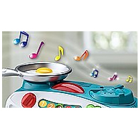 Press the chef's hat for learning songs, or listen and learn along to fun phrases.